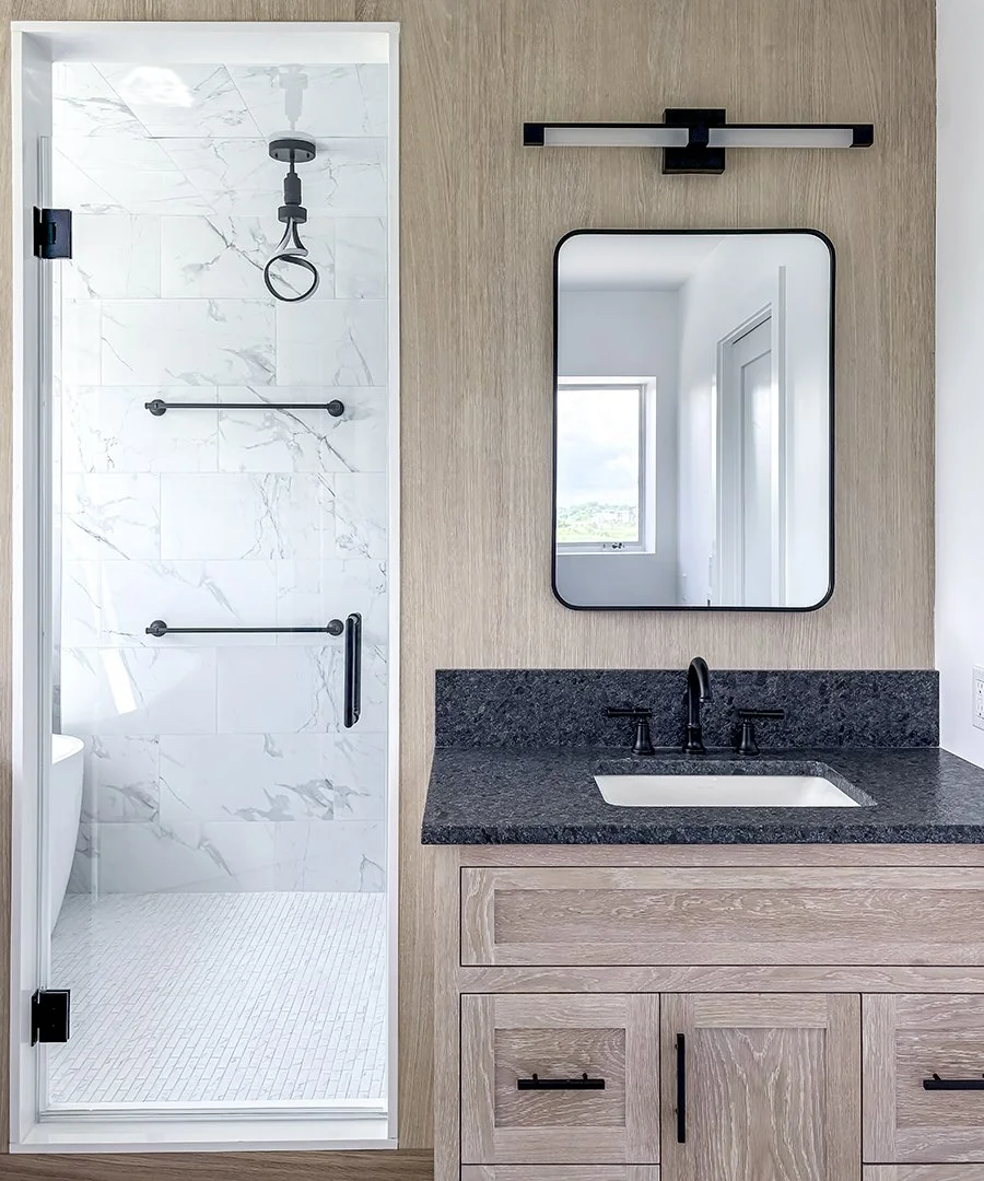 Bathroom vanity with shaker cabinet doors made using cope and stick construction by Wood & Co.