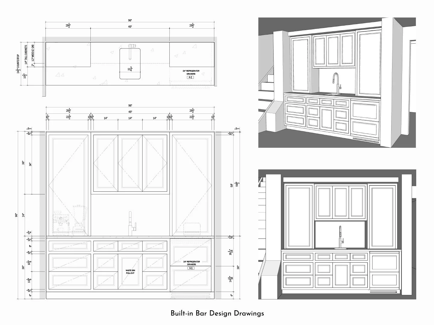 Design drawings, such as these ones for a built-in bar by Wood & Co., focus on the overall look, feel, and design intent. They’re not limited to flat 2D drawings, but they can also be supplemented by photos, sketches, and 3D models.