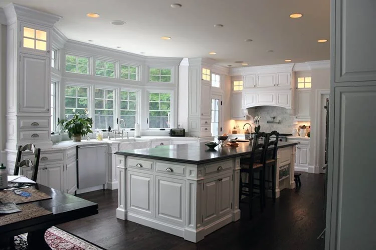 Raised panel doors add intricacy in this classic white kitchen
